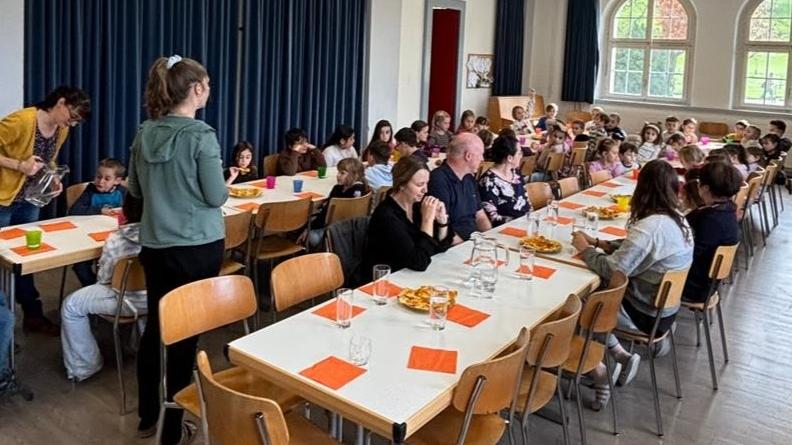 Gleich am Dienstagmorgen ging es mit dem ersten grossen Highlight los. Mit viel Elan und Freude machten sich die Kinder vom Kindergarten bis zur 2. Klasse an die Arbeit. Es wurde geschnippelt, zubereitet, gekocht, probiert und ein wunderbares Essen gezaubert. Die meisten Zutaten für das Erntedankfest stammten aus dem eigenen Garten. Aus dem Kürbis wurden eine leckere Kürbissuppe und Flammkuchenstücke zubereitet und aus dem Gemüse entstanden gar leckere Pizzaschnecken. Die riesige Arbeit wurde beim gemeinsamen Mittagessen gefeiert. Niemand kam zu kurz, so durften auch alle Lehrpersonen vom Schulhaus an diesem besonderen Anlass teilhaben.